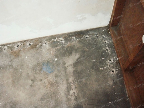 พอรู้ว่าปลวกขึ้นมาจากรอยแตกระหว่างพื้นกะผนัง แล้วก็รอยแตกอื่นๆ ก็จัดการเจาะรูเพื่อหยอดน้ำยาไล่ปลวก(ผมว่ามันเป็นน้ำยาไล่มากกว่ากำจัด) เริ่มจากเจาะแถวๆ ขอบพื้นที่ชิดกับผนัง ขนาดรูที่เจาะประมาณเซ็นนึง กะว่าหยอดน้ำยาแบบเน้นๆ จะได้ไปๆ ซะที เจาะไปเรื่อยๆ กินน้ำกินหนม กินกล้วยแขก เหนื่อยก็พัก หายเหนื่อยก็เจาะต่อ ชิลๆ ขำๆ